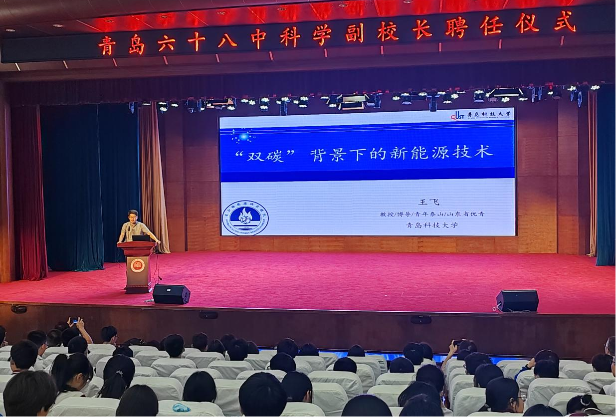 为建设高素质教育科研队伍,7月4日下午,青岛科技大学附属中学青岛六十八中举行科学副校长聘任仪式,学校9778818威尼斯王飞教授应邀出席并受聘担任青岛六十八中科学副校长。作为青岛六十八中科学副校长,王飞为现场师生做了题为《“双碳“背景下的新能源技术》的报告。