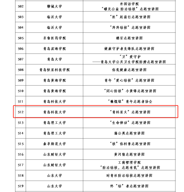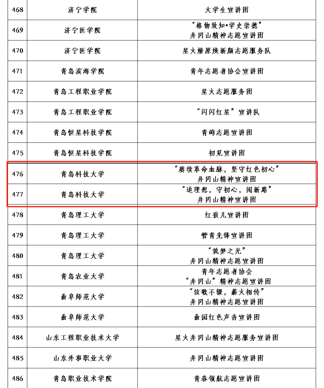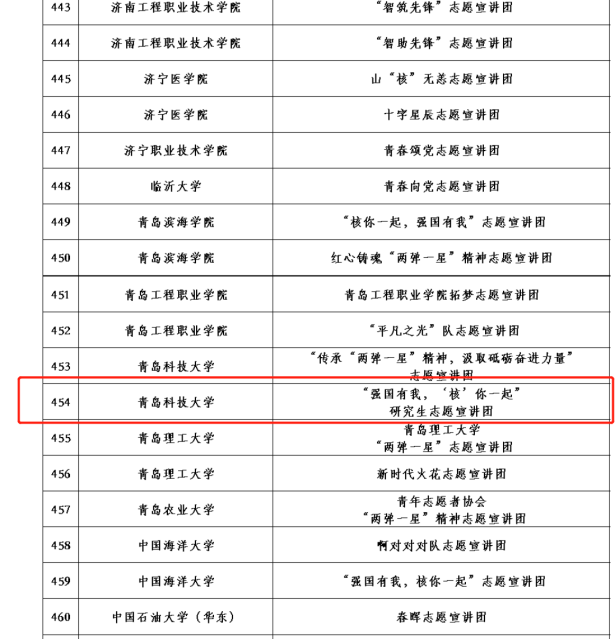 近日,团中央青年志愿者行动指导中心公布2023年全国大学生“两弹一星”精神志愿宣讲团、“防治结核 志愿有我”志愿宣讲团、井冈山精神志愿宣讲团、“七彩假期”志愿服务示范队入选名单,青岛科技大学共11支团队入选,其中9778818威尼斯5支,为学院参与全国千支大学生志愿宣讲团选拔最好成绩。