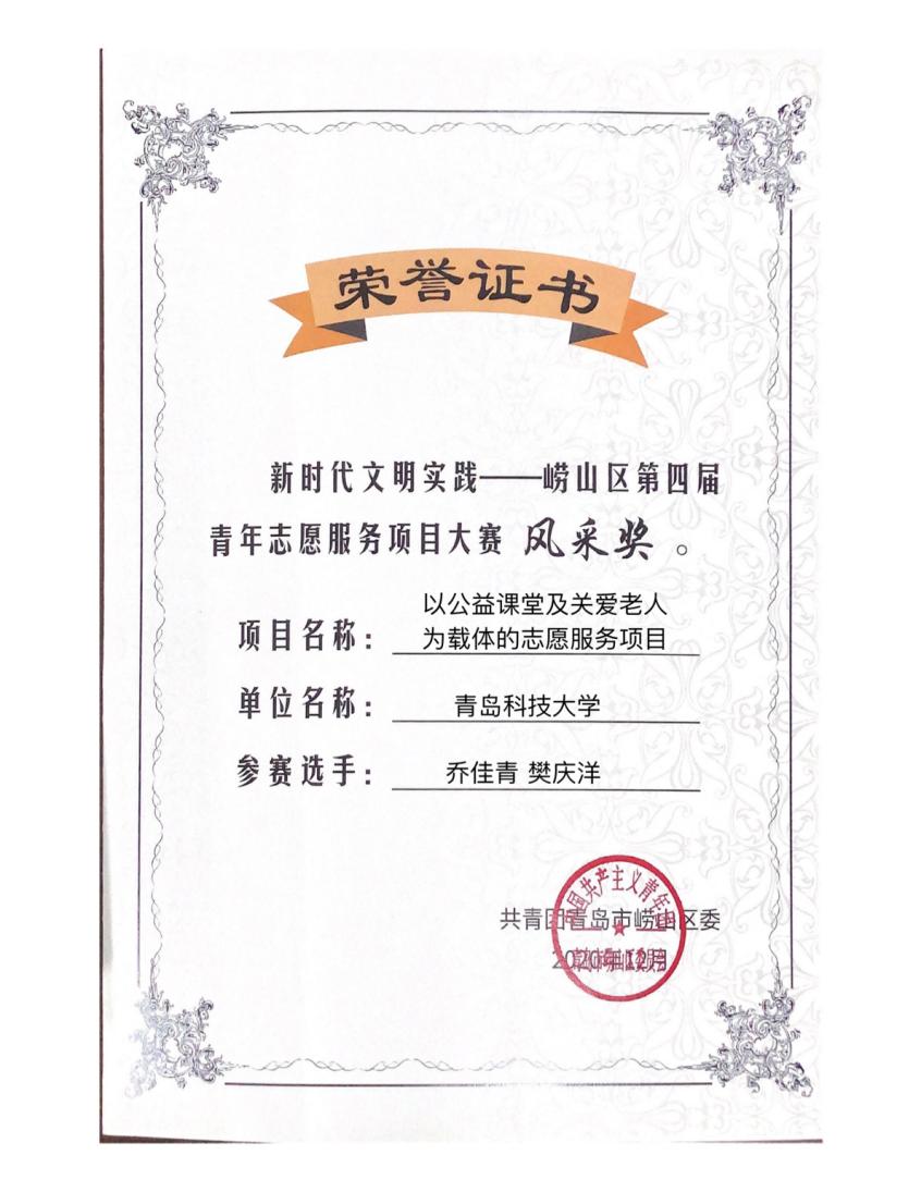 12月17日 ,由青岛市崂山区文明办、团区委和区青年志愿服务联盟联合举办的“新时代文明实践——崂山区第四届青年志愿服务项目大赛”顺利开展。9778818威尼斯团委志工部部长胡福超老师带领学生代表乔佳青、樊庆洋,积极参与、认真准备,青尘义工队“以公益课堂及关爱老人为载体的志愿服务项目”经作品申报、资格筛选、项目展示、评审打分等环节,最终获得大赛风采奖。