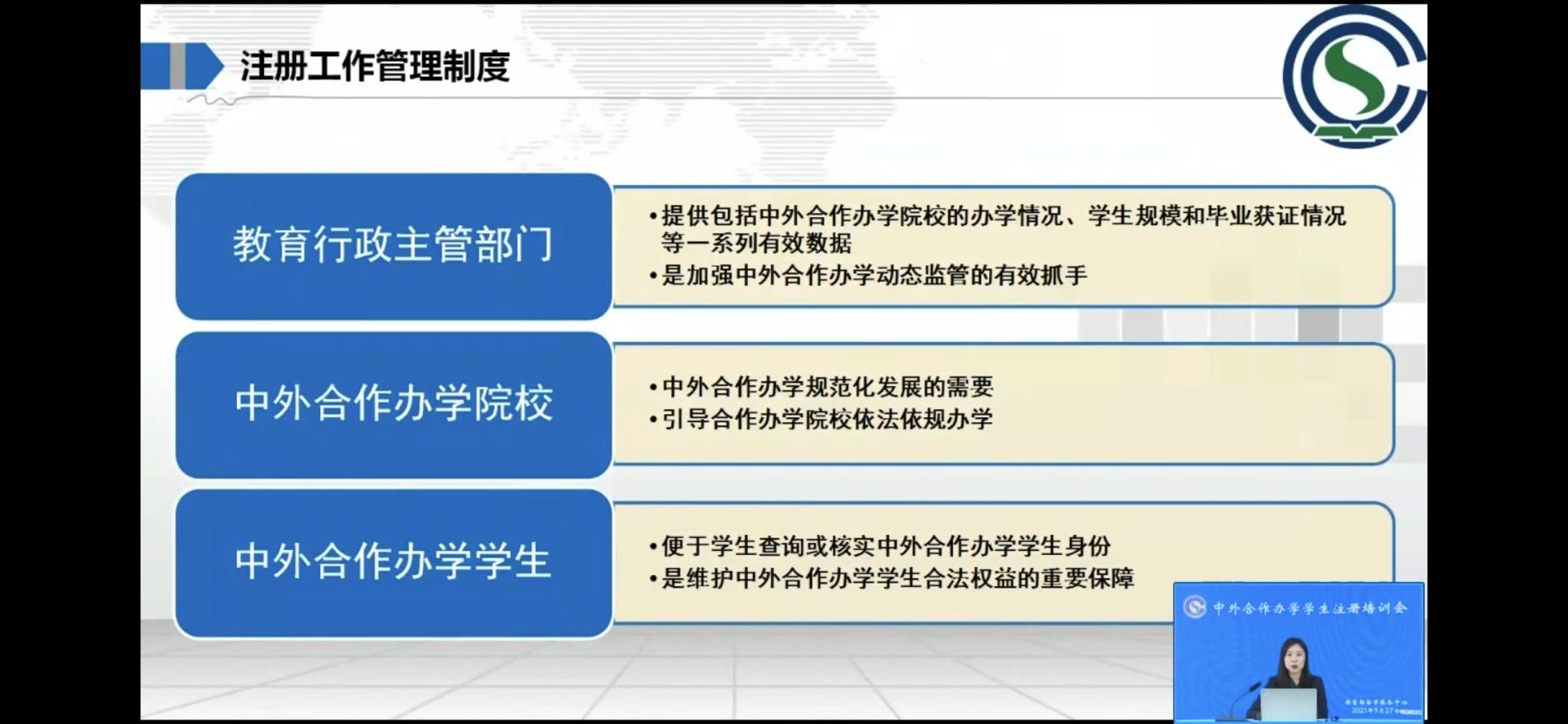 此次培训会邀请教育部国际司领导出席并讲话,邀请中外合作办学领域专家分享中外合作办学工作的实践经验和思考;培训会还介绍中外合作办学学生注册工作管理制度,讲解中外合作办学学生注册系统的新功能、相关工作标准和操作流程,达到增进交流、规范管理的目的。